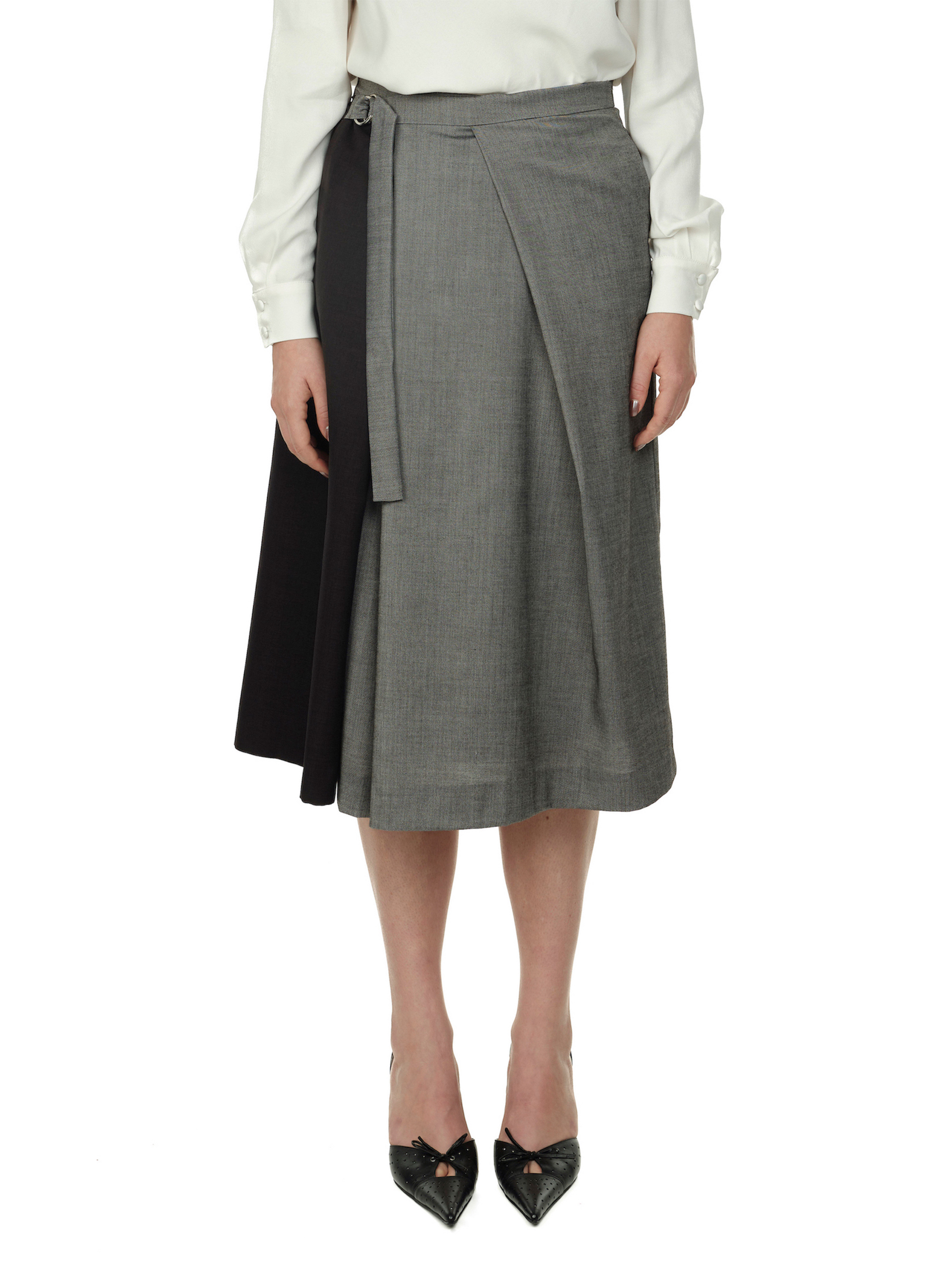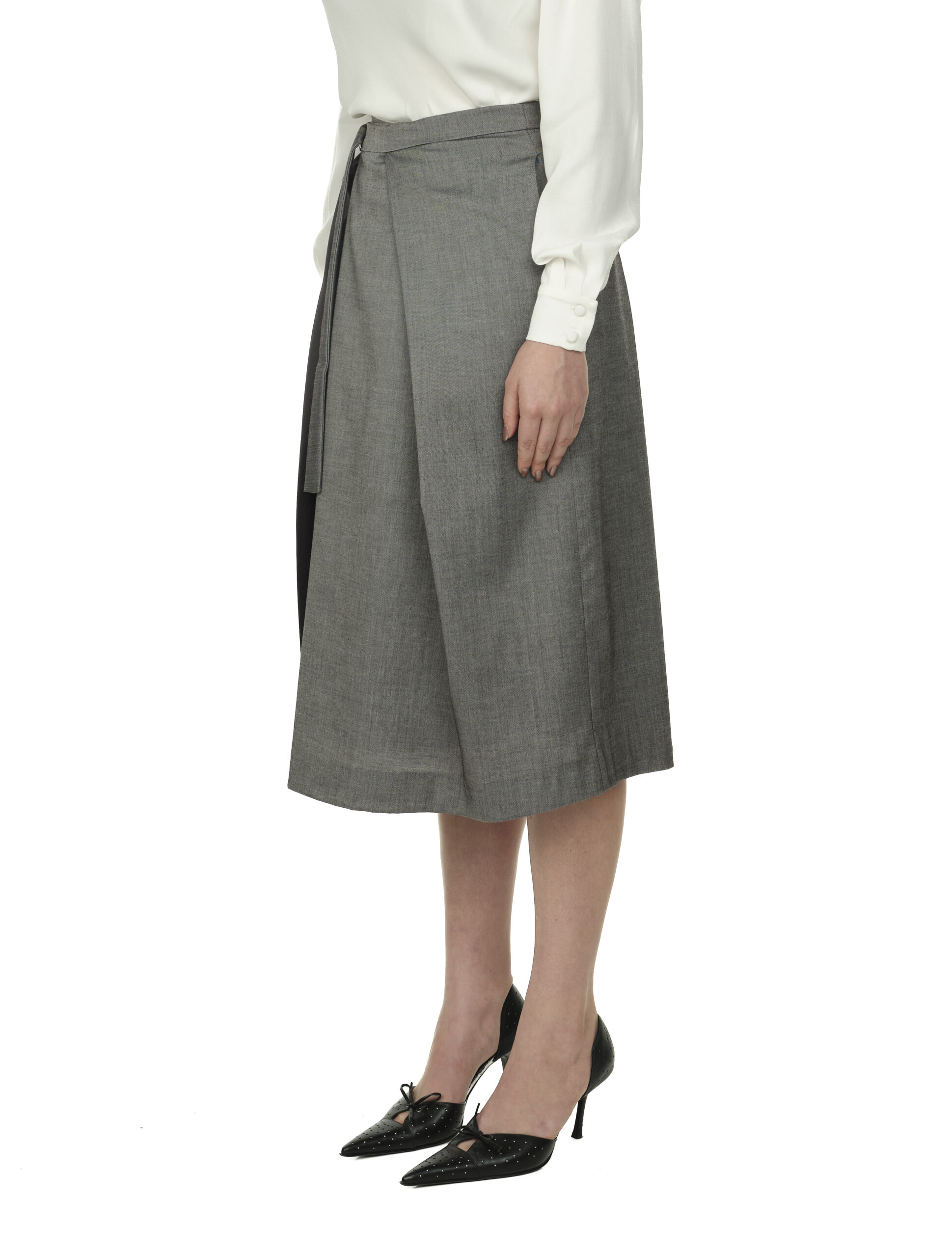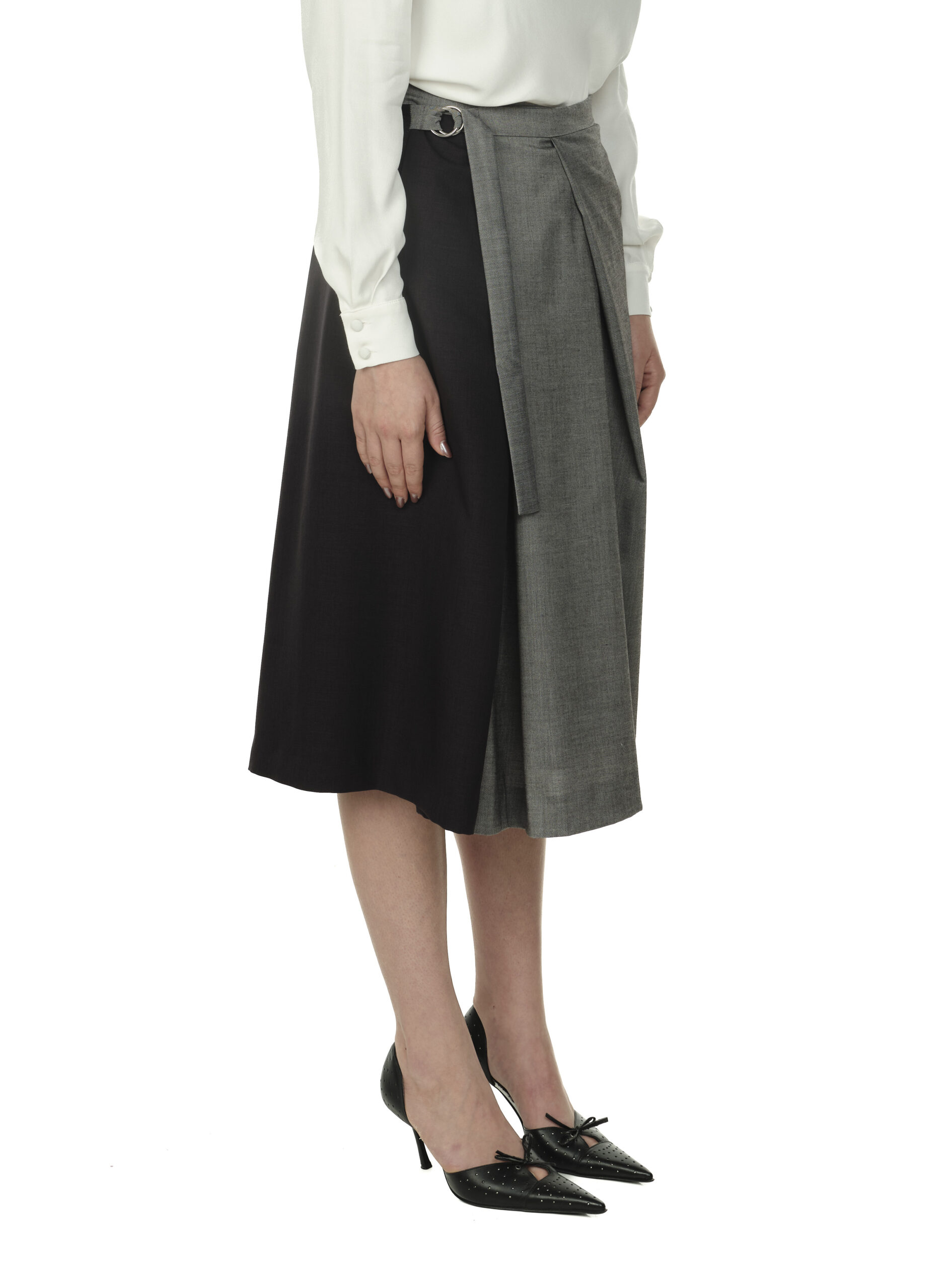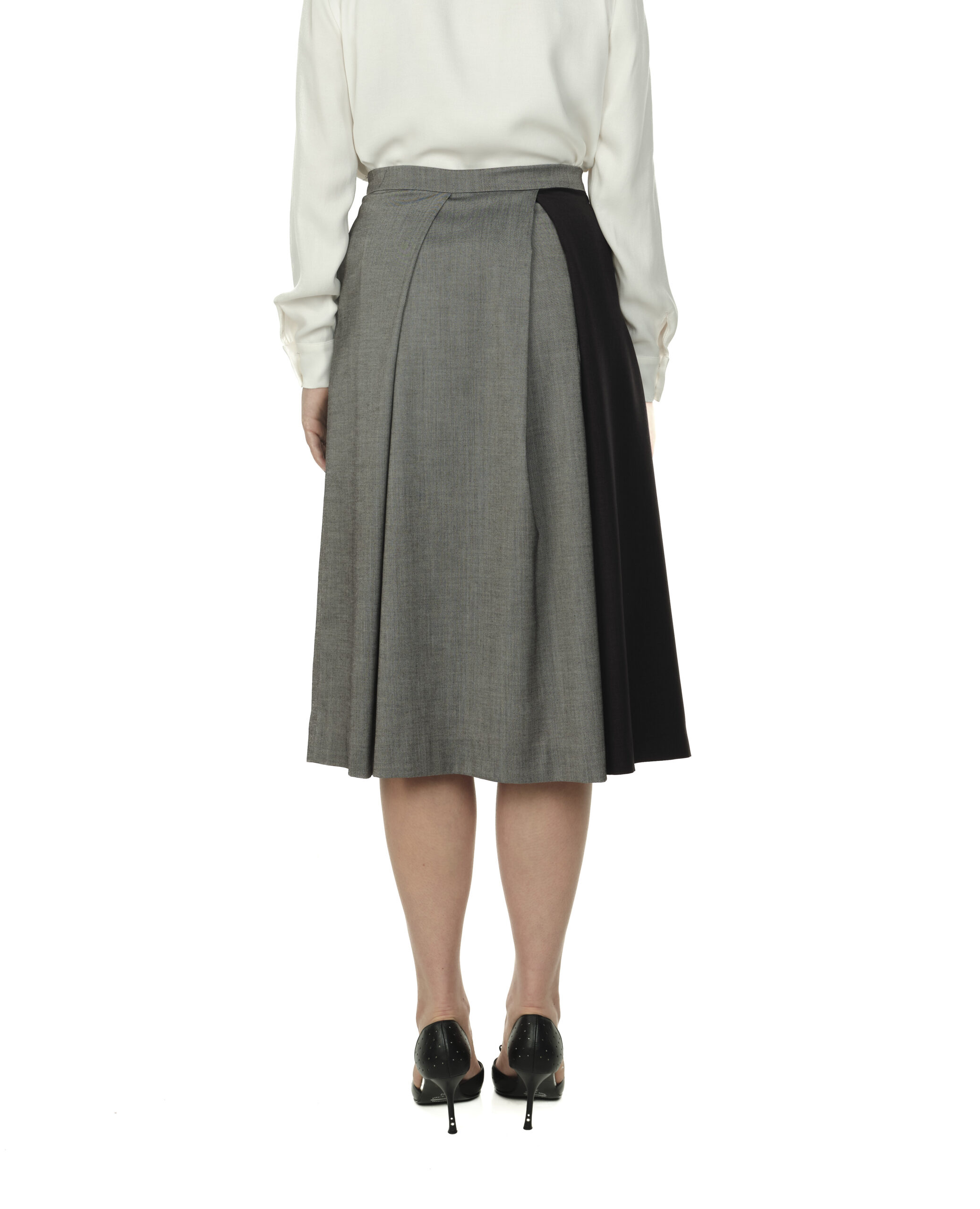 Fustă midi din stofă, cu panou asimetric in contrast bleumarin cu gri. Talie înaltă și pliuri adânci în față și spate pentru o ținută elegantă și lejeritate. Închidere cu doi nasturi ascunși și cordon reglabil care se prinde lateral în două catarame metalice. Buzunare pe ambele părți ale fustei.