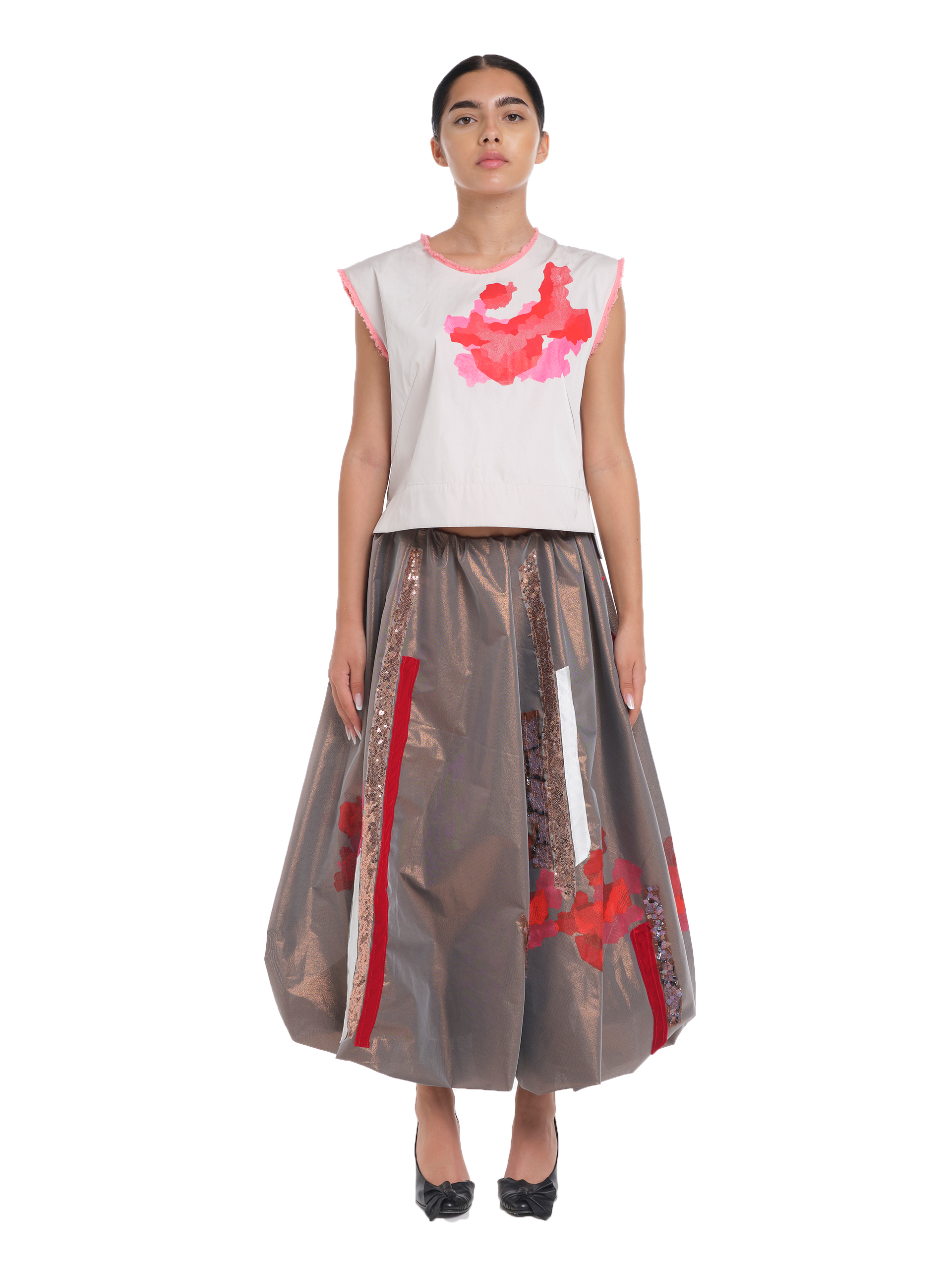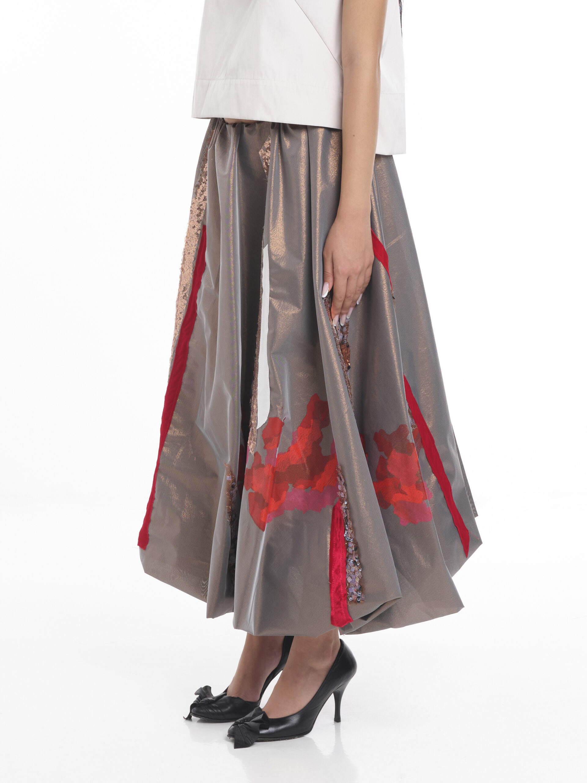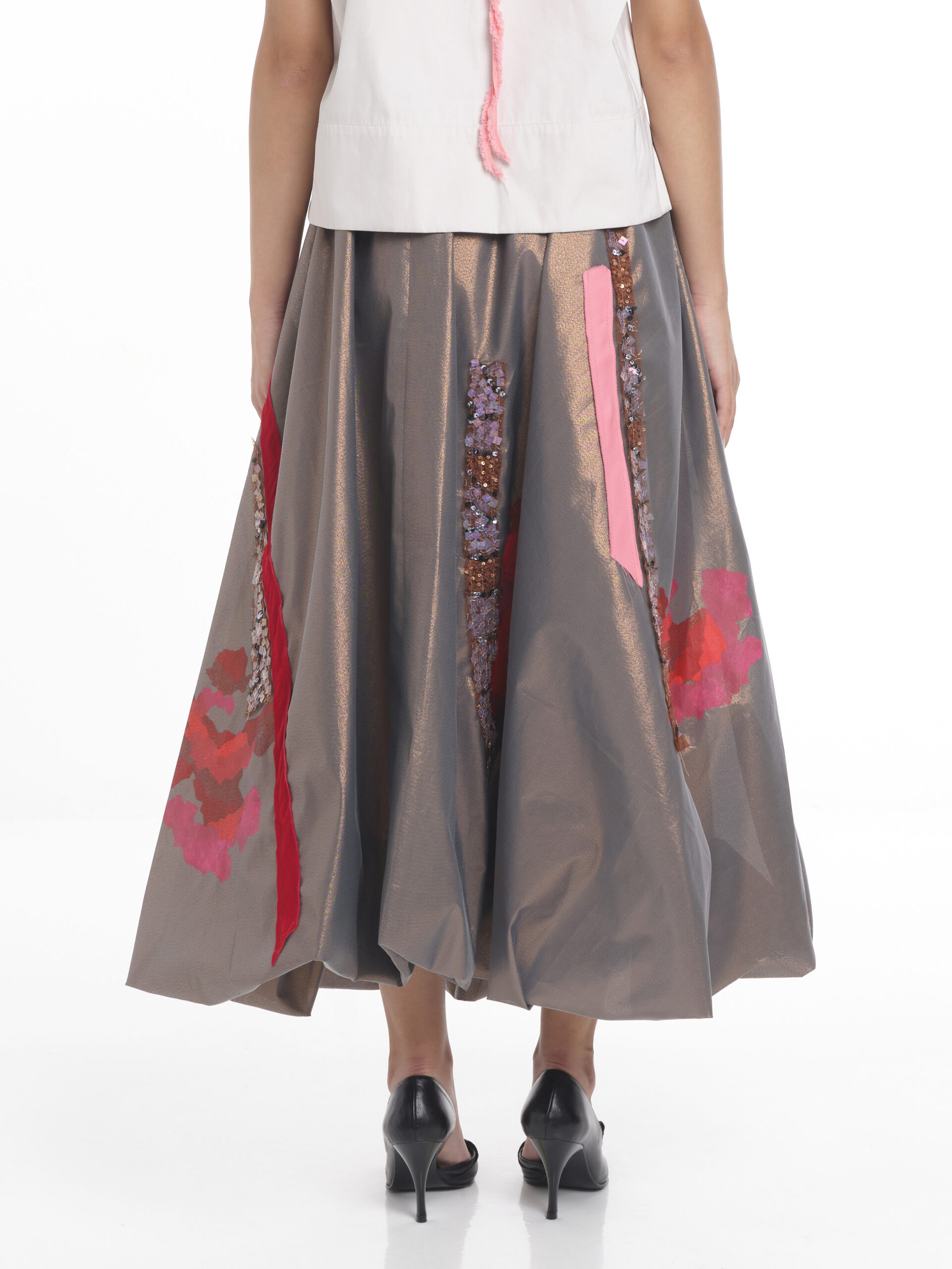 Fustă midi tip balon cu aplicații din diferite texturi de materiale și imprimeu stilizat cu trandafir în nuante de roz intens și rosu, poziționate față spate. Betelie elastică.