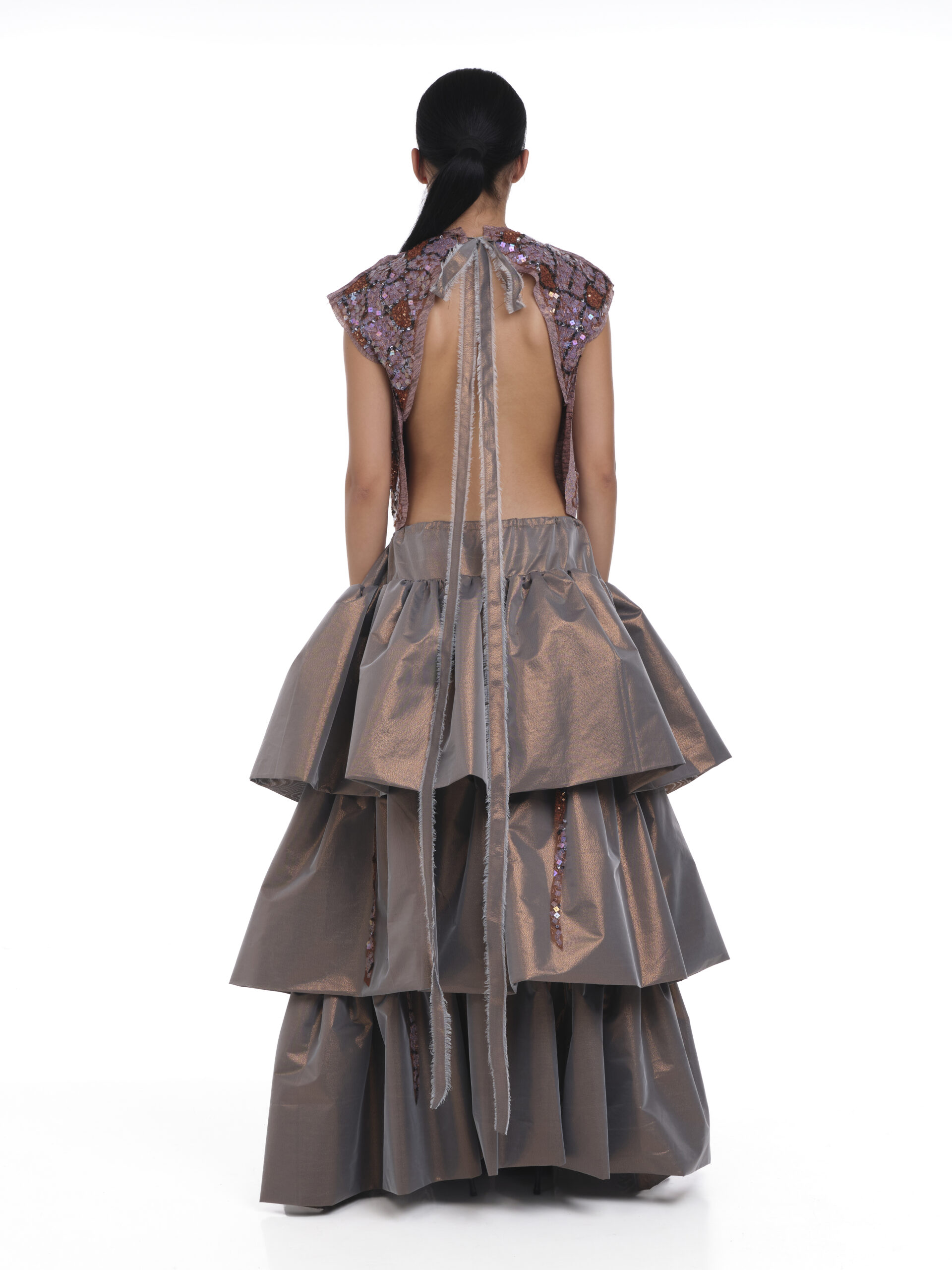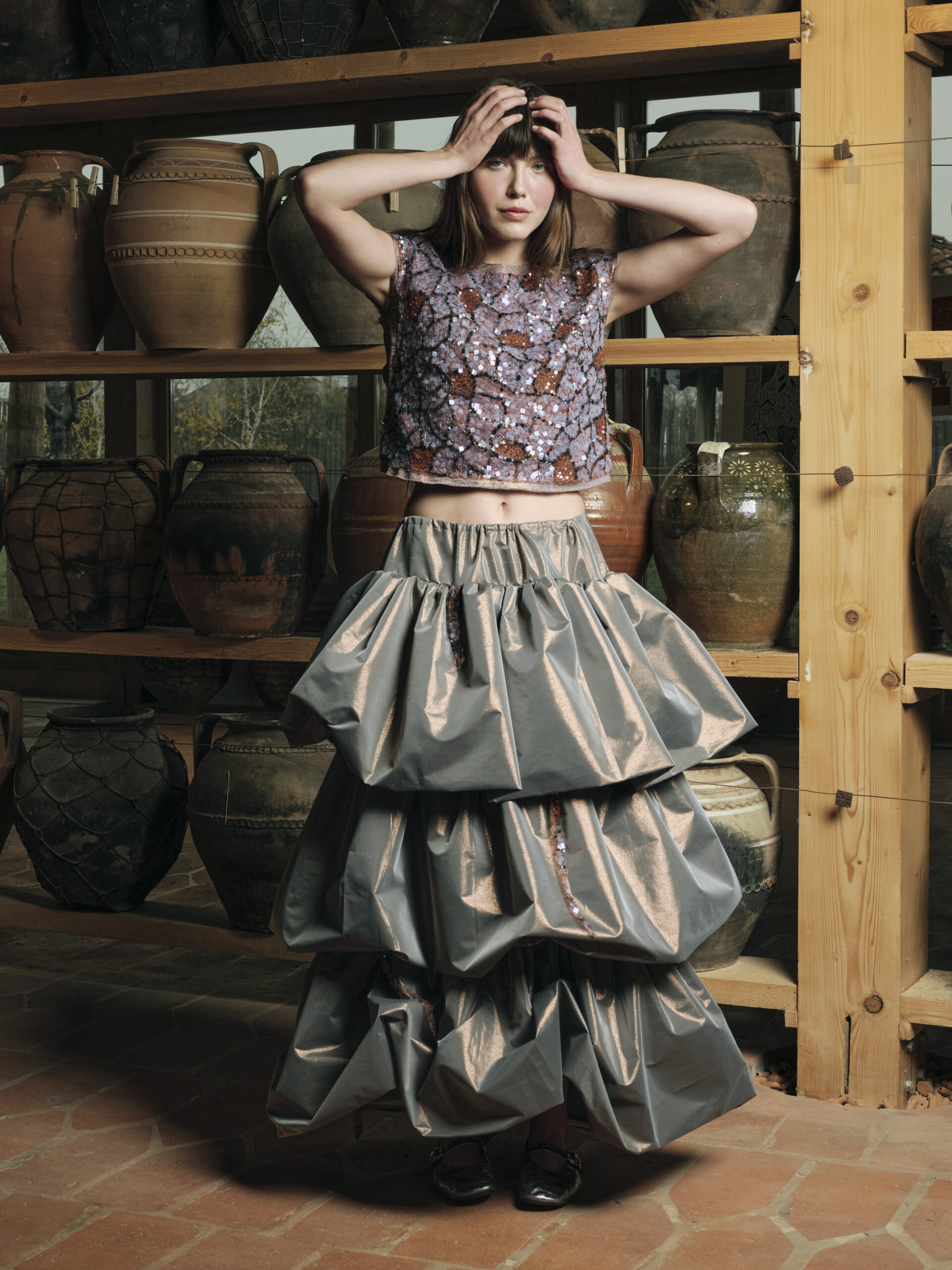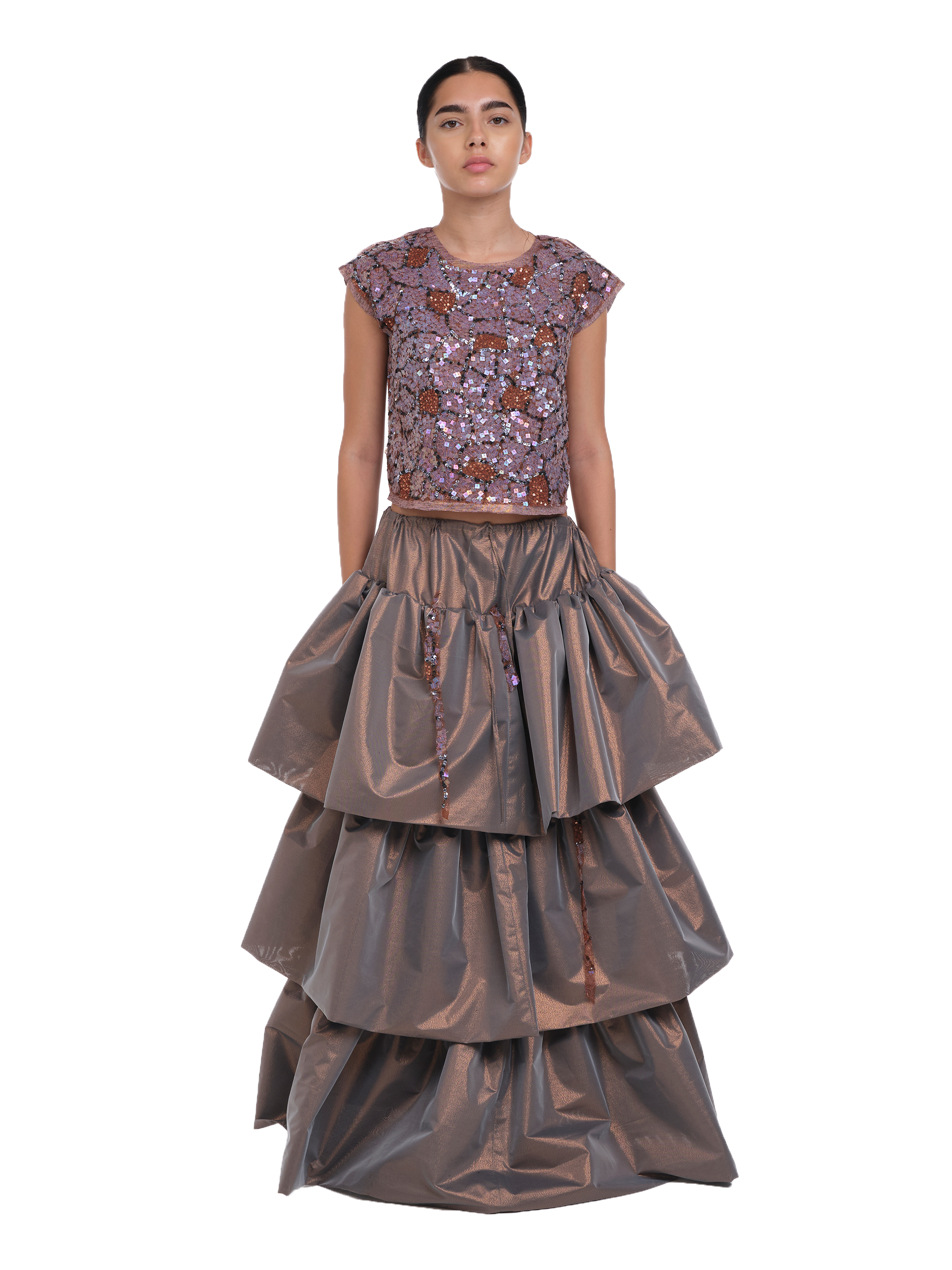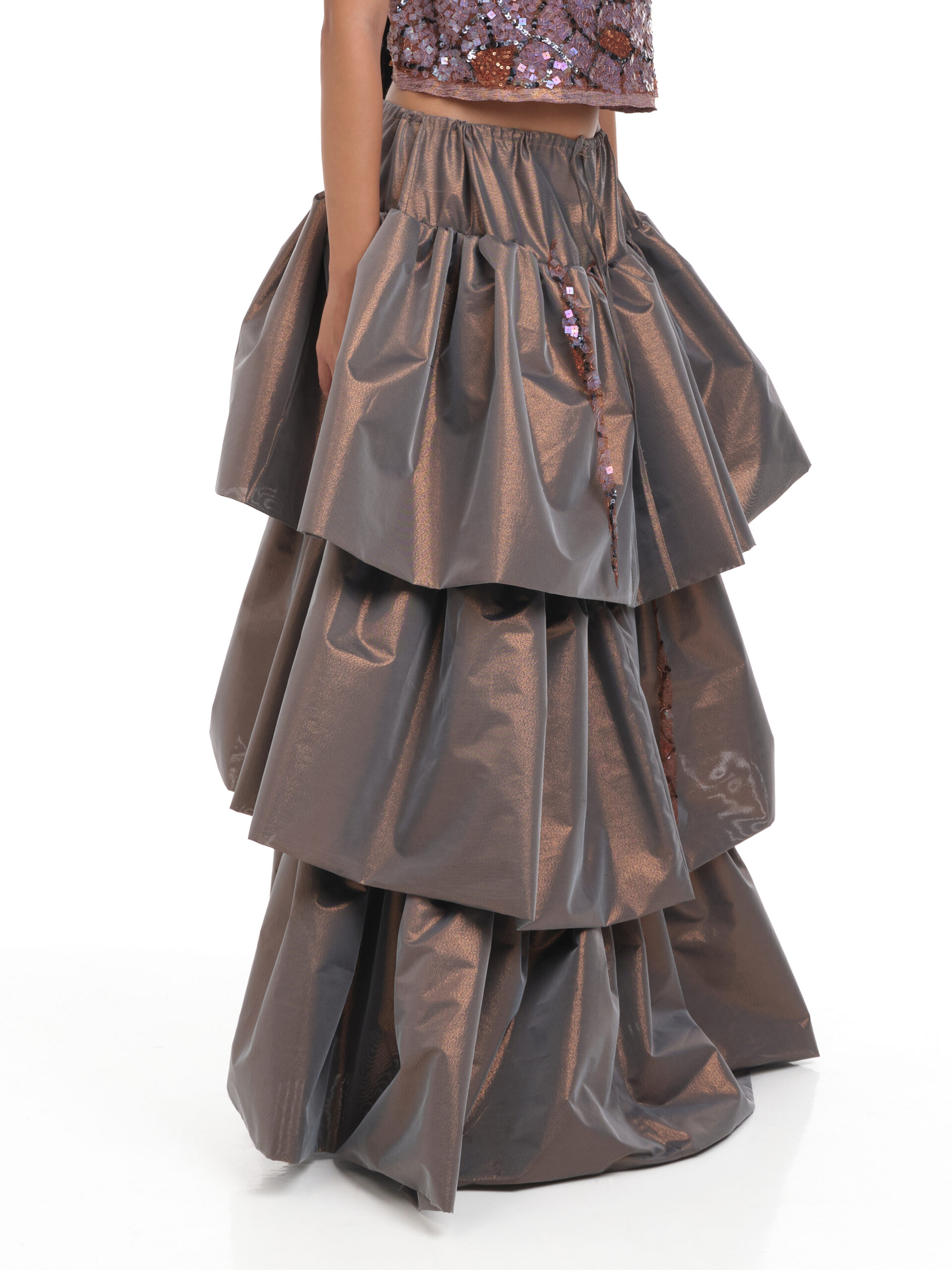 Fustă lungă din material metalizat, cu talie elastică cu snur și volum amplu în straturi suprapuse de volane. Detalii cu șnururi cu paiete aplicate între volane in diferite pozitii aleatorii.