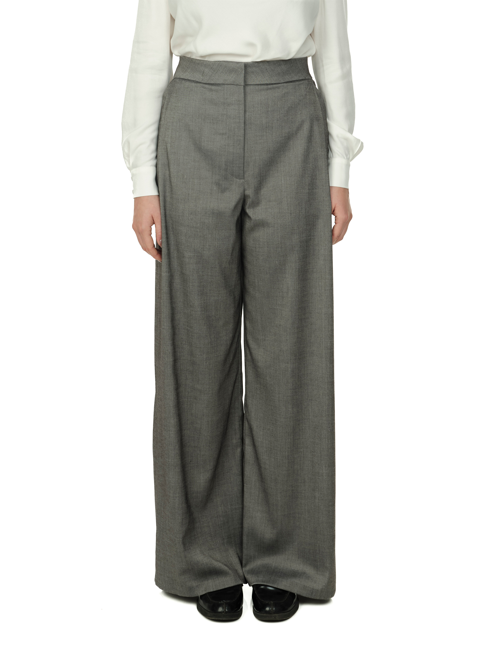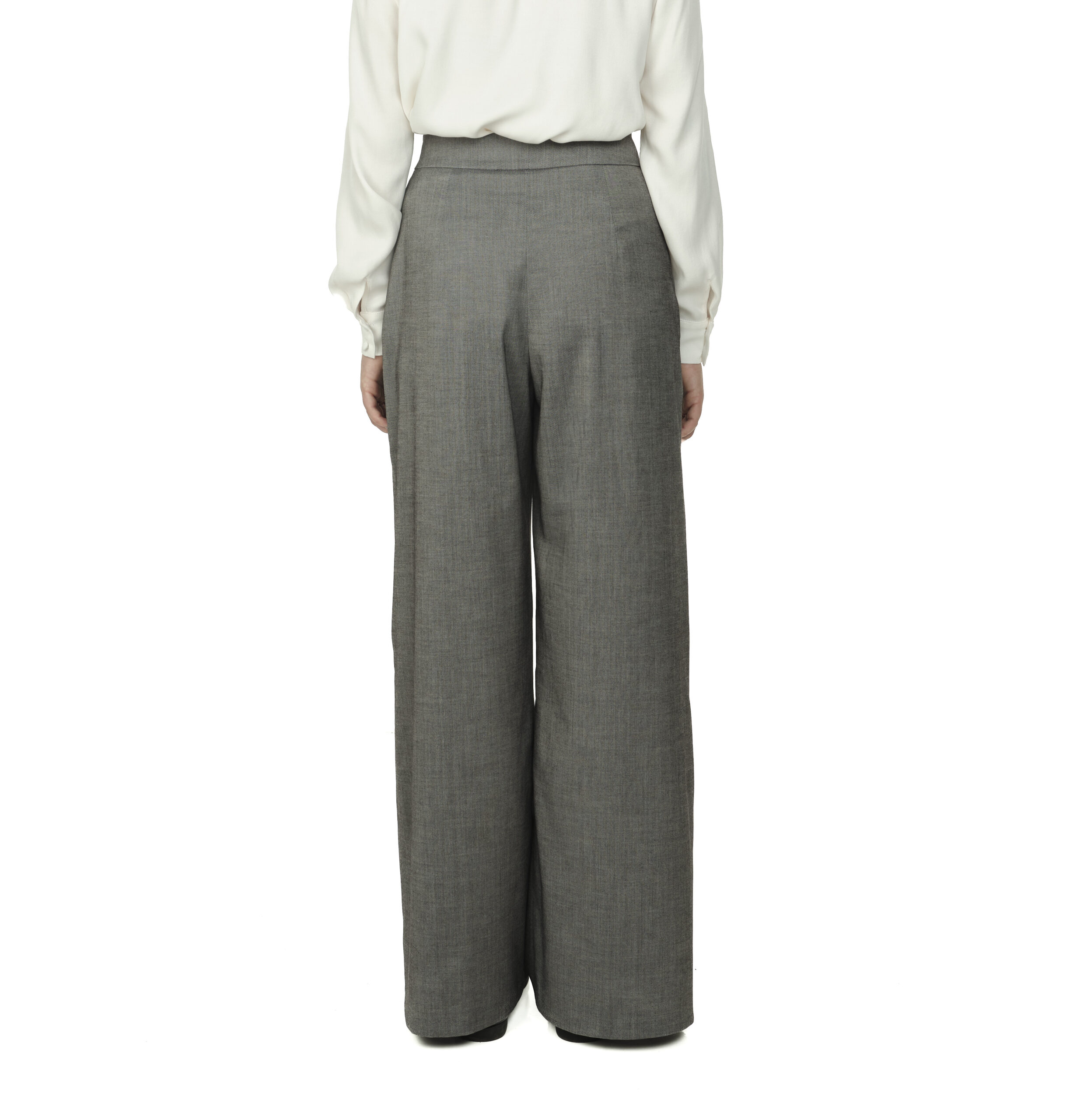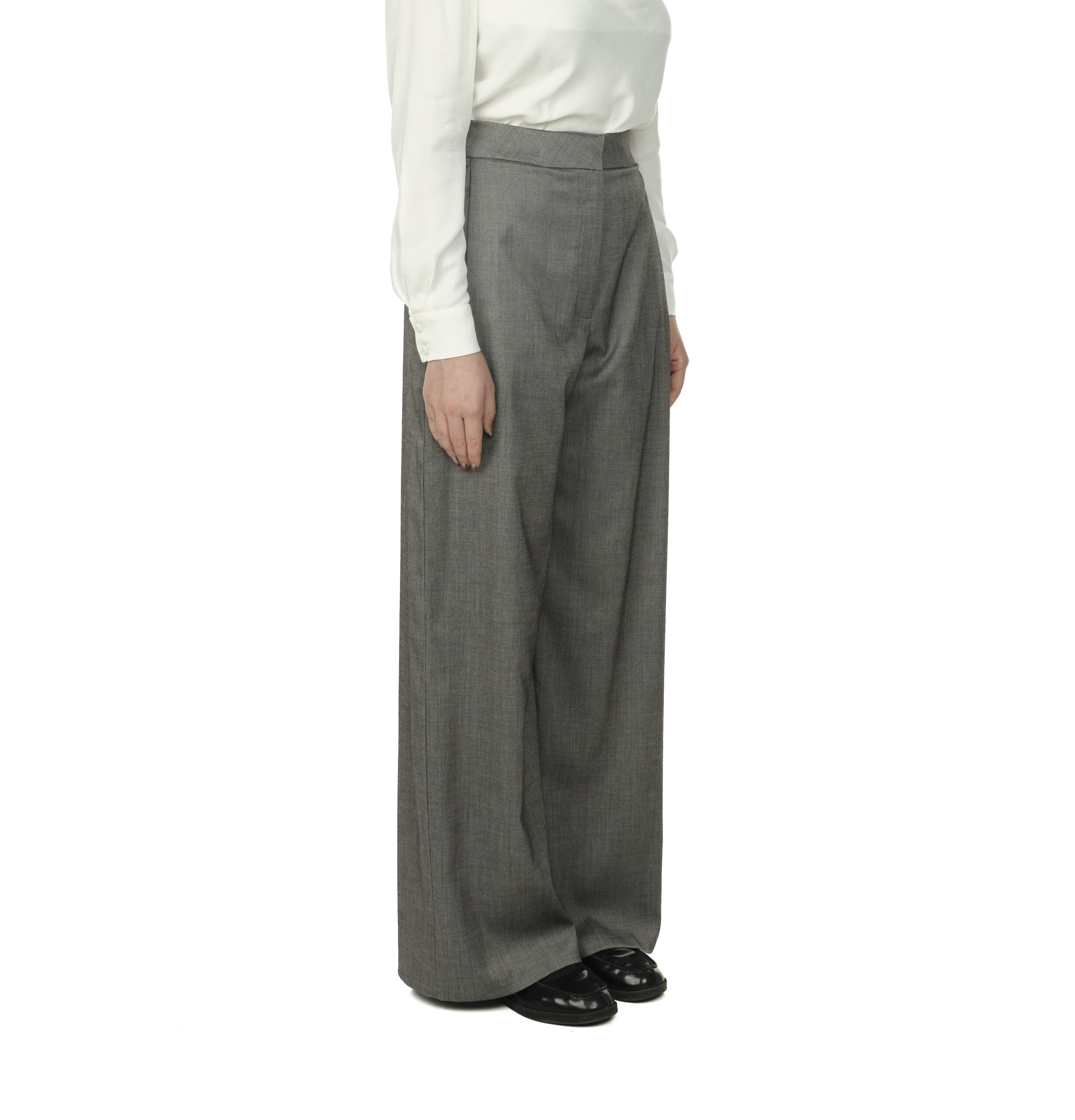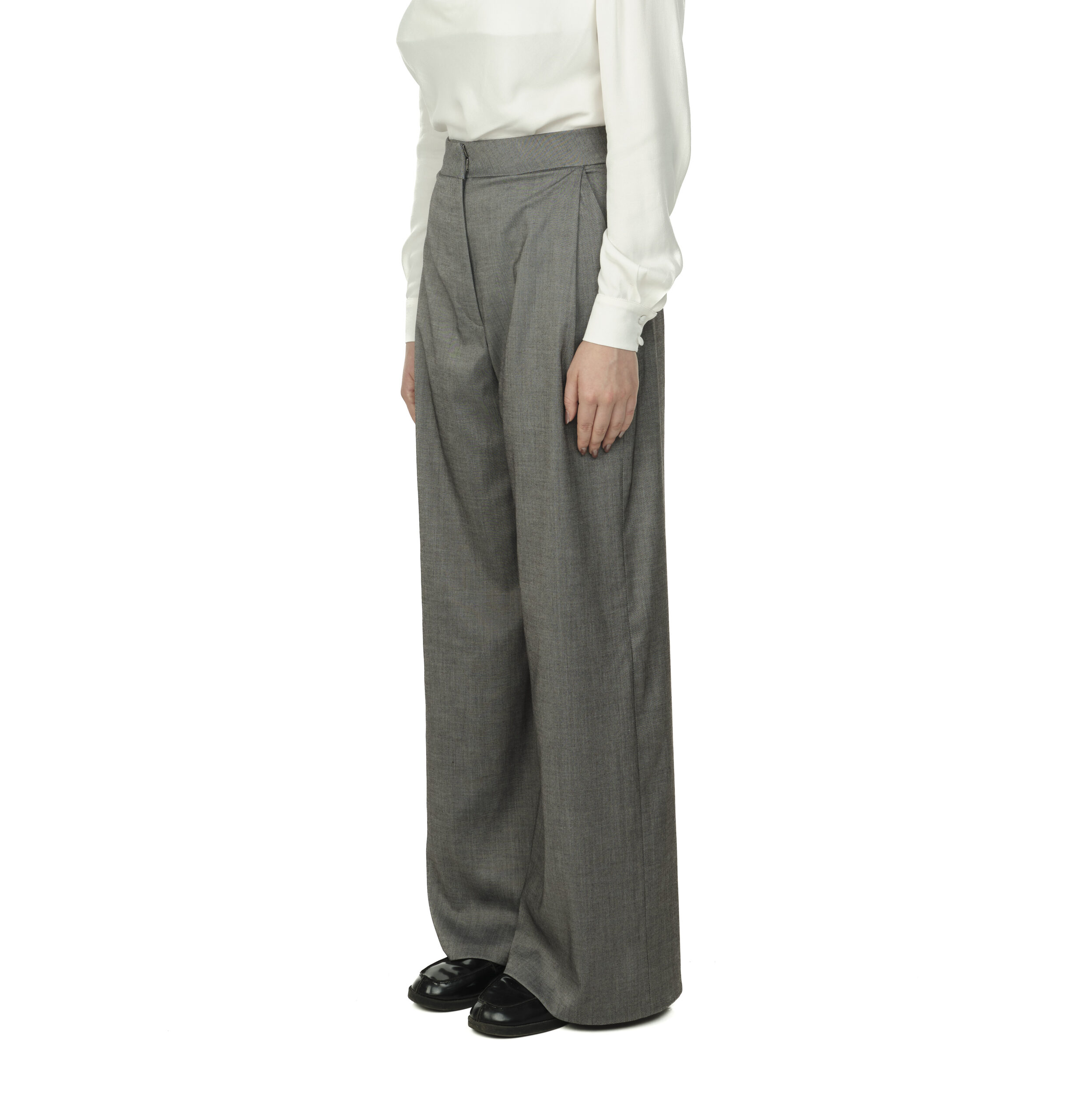 Pantalon drept din stofă subțire, cu talie înaltă și croială lejeră. Pliuri fine, pozitionate lateral lângă buzunare, pentru a crea lejeritate. Închidere frontală cu sistem tip cârlig, nasture interior și fermoar.